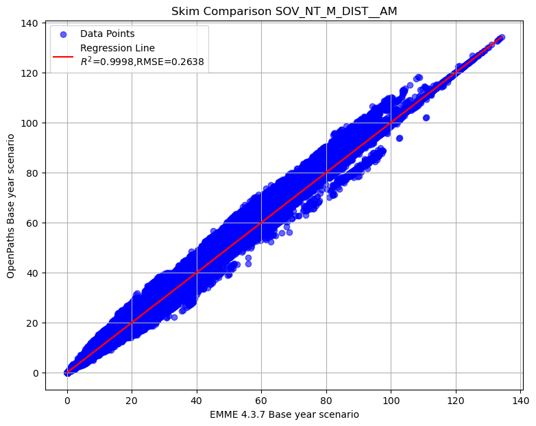 Scenarios to be compared: EMME 4.3.7 Base year scenario VS OpenPaths Base year scenarioAM Peak travel distance skim for SOV NT