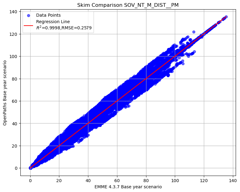 Scenarios to be compared: EMME 4.3.7 Base year scenario VS OpenPaths Base year scenarioPM Peak travel distance skim for SOV NT