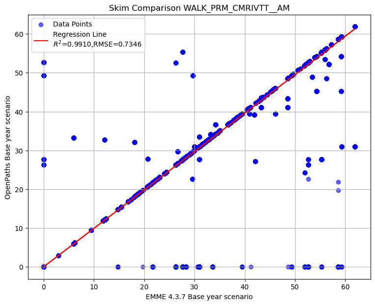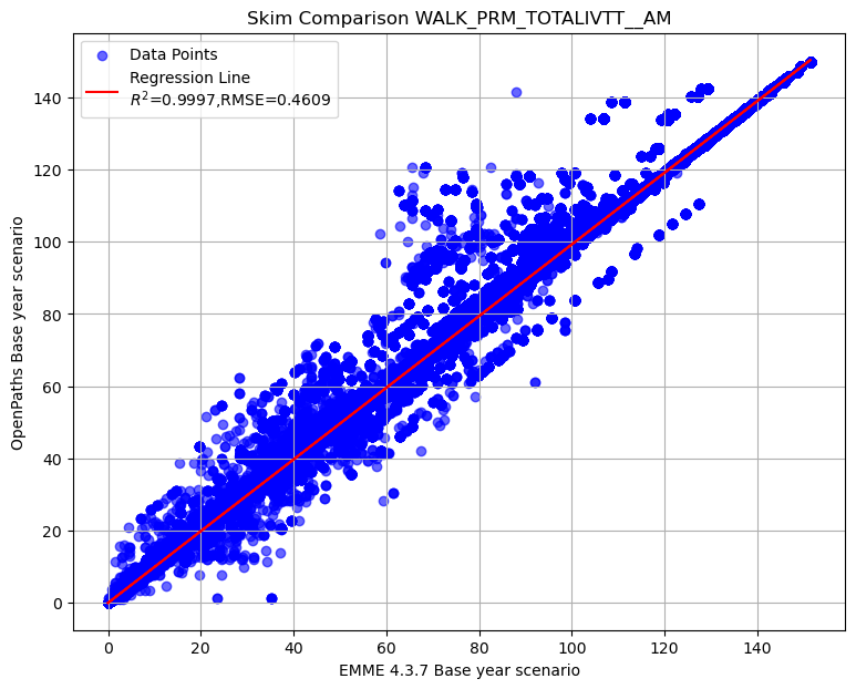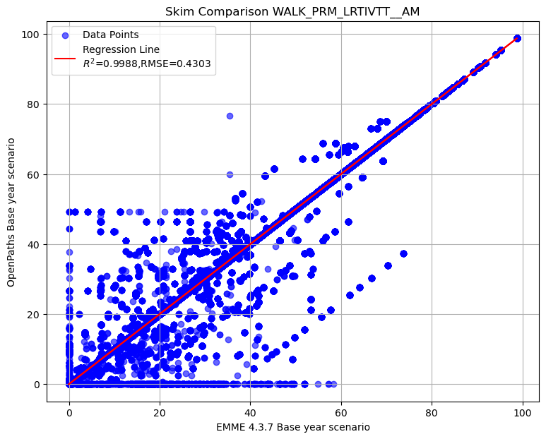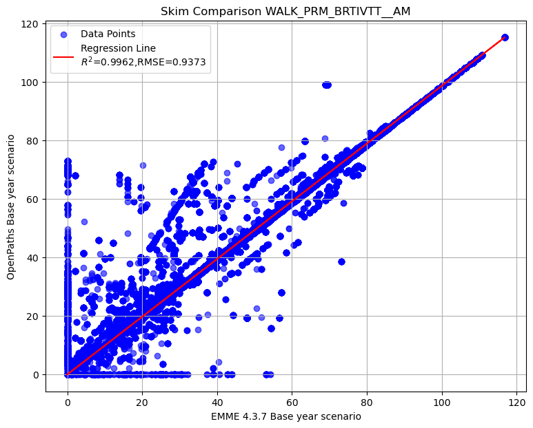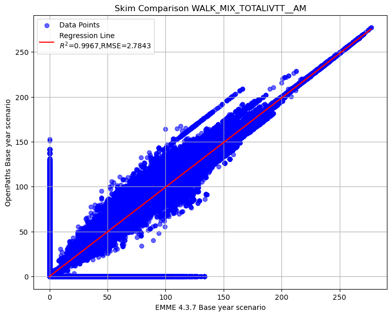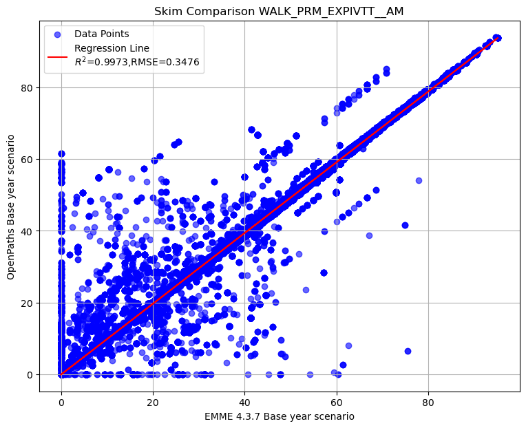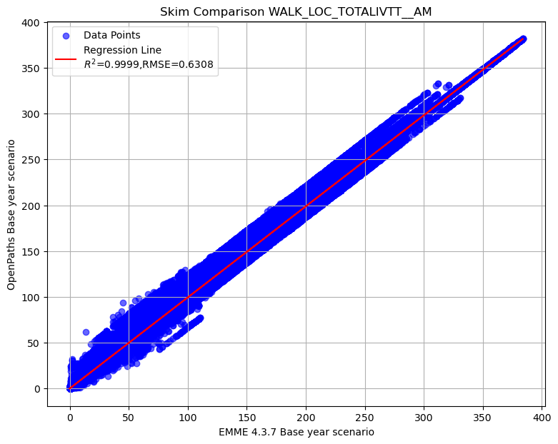 Summary of transit AM skim comparison (EMME OpenPath - EMME 4.3.7)