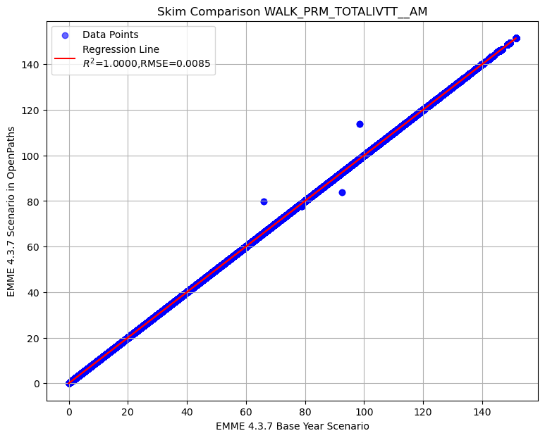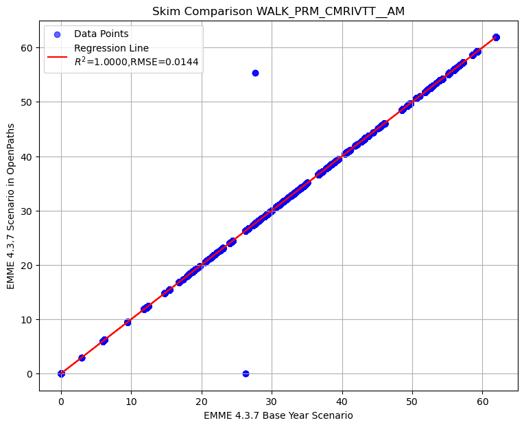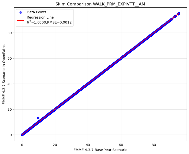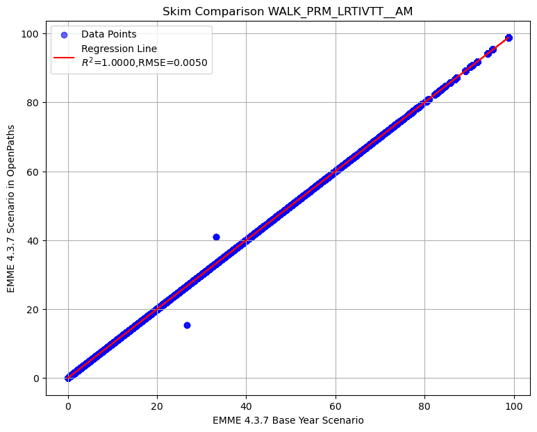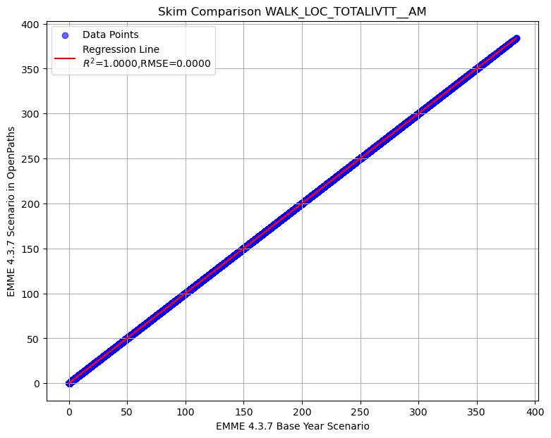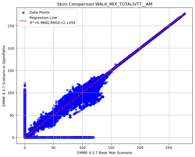 Summary of transit AM skim comparison (EMME OpenPath - EMME 4.3.7)