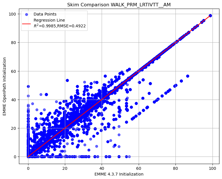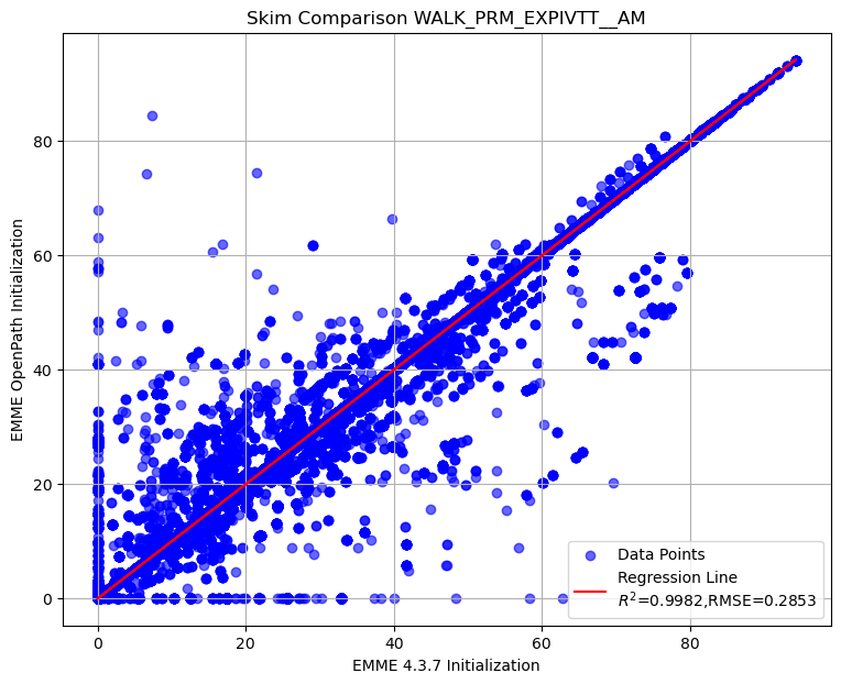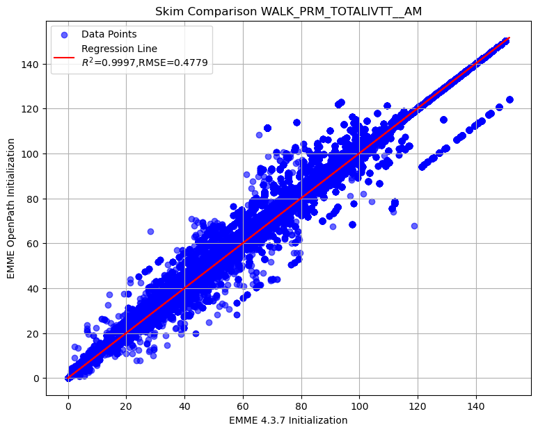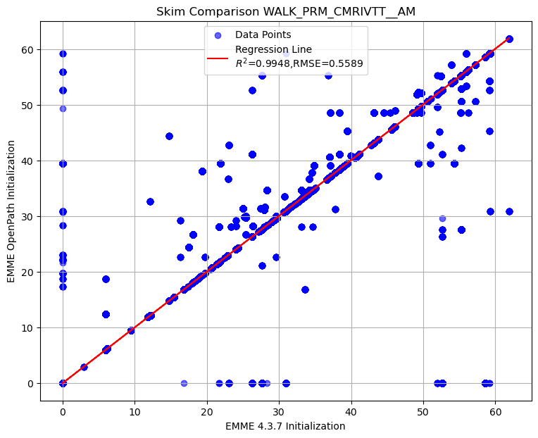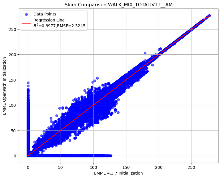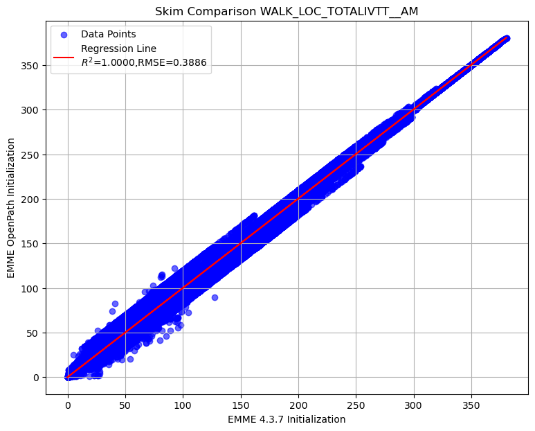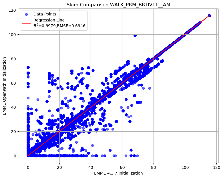 Summary of transit AM skim comparison (EMME OpenPath - EMME 4.3.7)