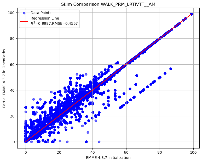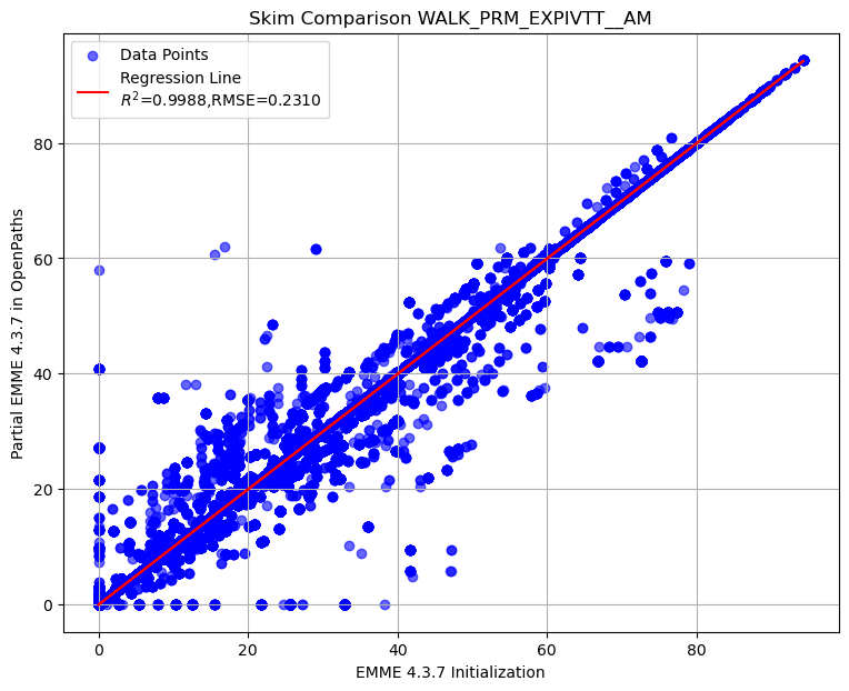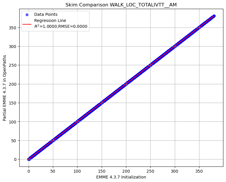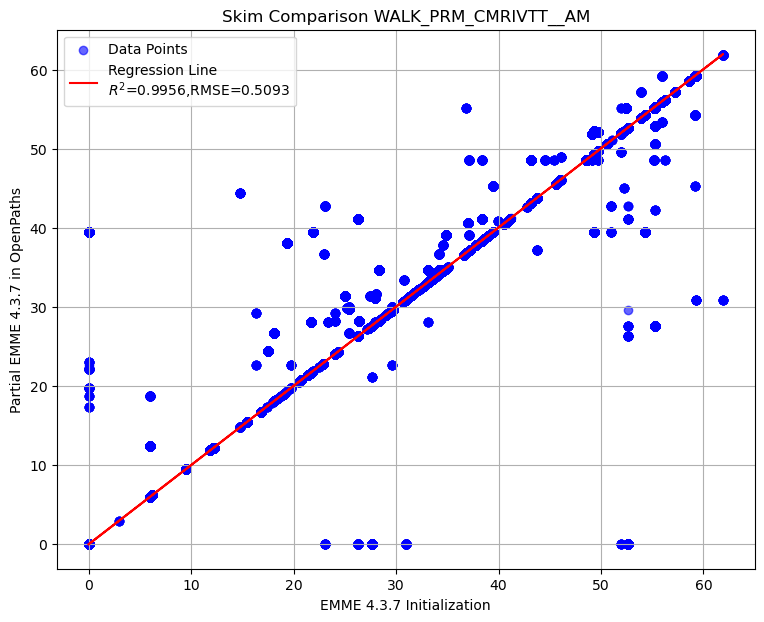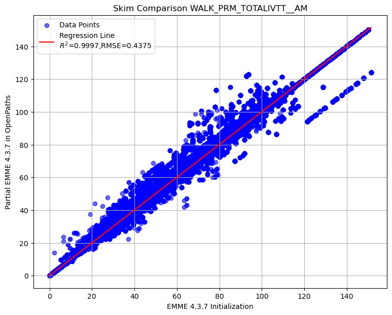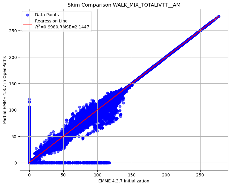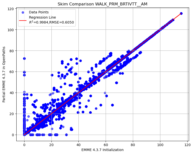 Summary of transit AM skim comparison (EMME OpenPath - EMME 4.3.7)